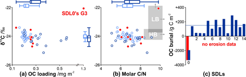 图3.常态沉积层(淡蓝)、历史风暴沉积层(深蓝)和新风暴沉积层(红色)的有机碳特征及风暴事件中的有机碳侵蚀/埋藏通量