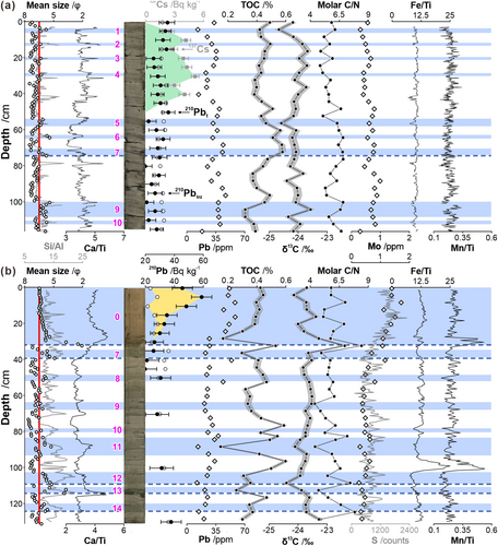 图2. 新风暴层(0)和历史风暴层(1-14)之间迥异的岩性和地球化学特征