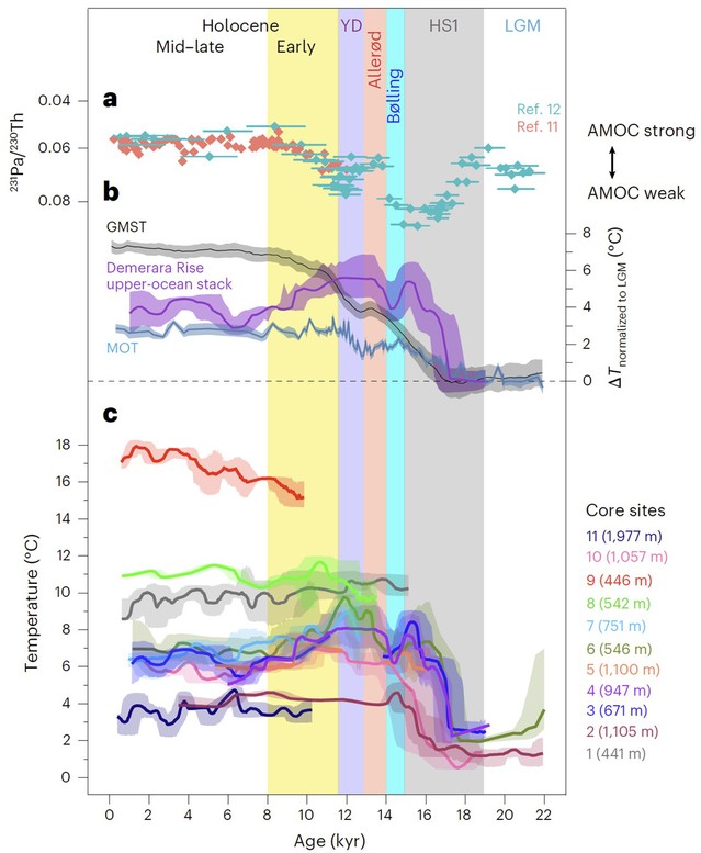 (3)1.47万年和早全新世(1.2万-8千年前),大西洋中-上层海水变冷,揭示了amoc强度恢复,导致更多的热量向北输送,促进了北半球的变暖和冰消融化。