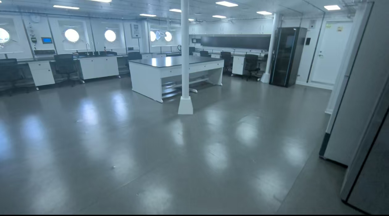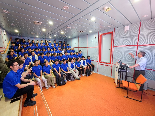 登船师生们按顺序参观了智能驾驶平台、舒适的生活休闲区、高性能实验室和多功能甲板作业区等,随后齐聚在阶梯教室,聆听学院院长、翦知湣院士主讲的“海上大学”开班第一课。翦老师回忆了多次参加国内外科考航次的经历,尽管收获颇多,但也有些许遗憾,希望能乘坐同济人建造的科考船探索深海大洋。在建院五十周年之际,这个梦想终于变成了现实,“同济”号正式交付使用,第一个任务就是承担本科生的海上实习航次,充分体现了学校对人才培养的高度重视。