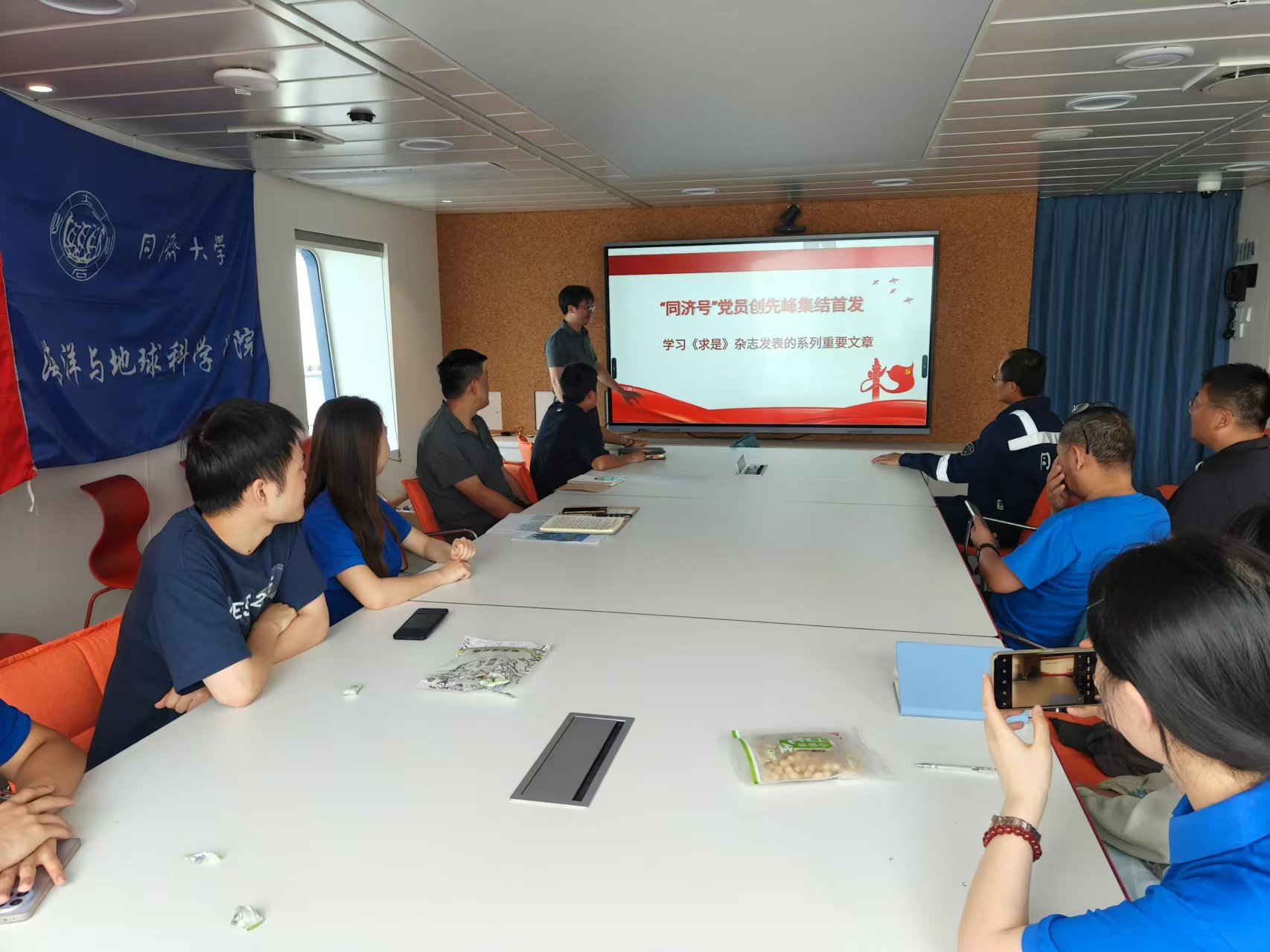 在全体科考人员与船员座谈之后,共产党员和入党积极分子留下来继续交流,经学院党委同意后成立了tj2502航次临时党支部,“同济”号党员创先锋集结首发,一起学习了《求是》杂志发表的系列重要文章,并围绕海洋科考中的挑战与成长、团结与奋斗展开深入交流,在风浪中凝聚起奋进的力量。