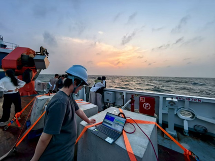 第三航段在杭州湾和长江口外东海海域开展海上专业综合实践,近、离岸各有一个连续站位。海上期间,以模块化实践任务为导向,锻炼和培养学生的现场团队协作和组织能力、采样与原位传感观测设备操作运用的动手能力和数据处理与衍生能力为主,该航段有15名本科生,按海洋地质采样技术、物理海洋观测技术、海洋化学观测技术、海洋生物观测技术和海上通讯技术等5个模块方向设置实践任务,每小组3-4人。每个模块任务开展期间,小组各成员自行组织有序开展海洋传感观测和通讯设备与仪器操作、观测与采样、数据分析与建模等全过程实操。