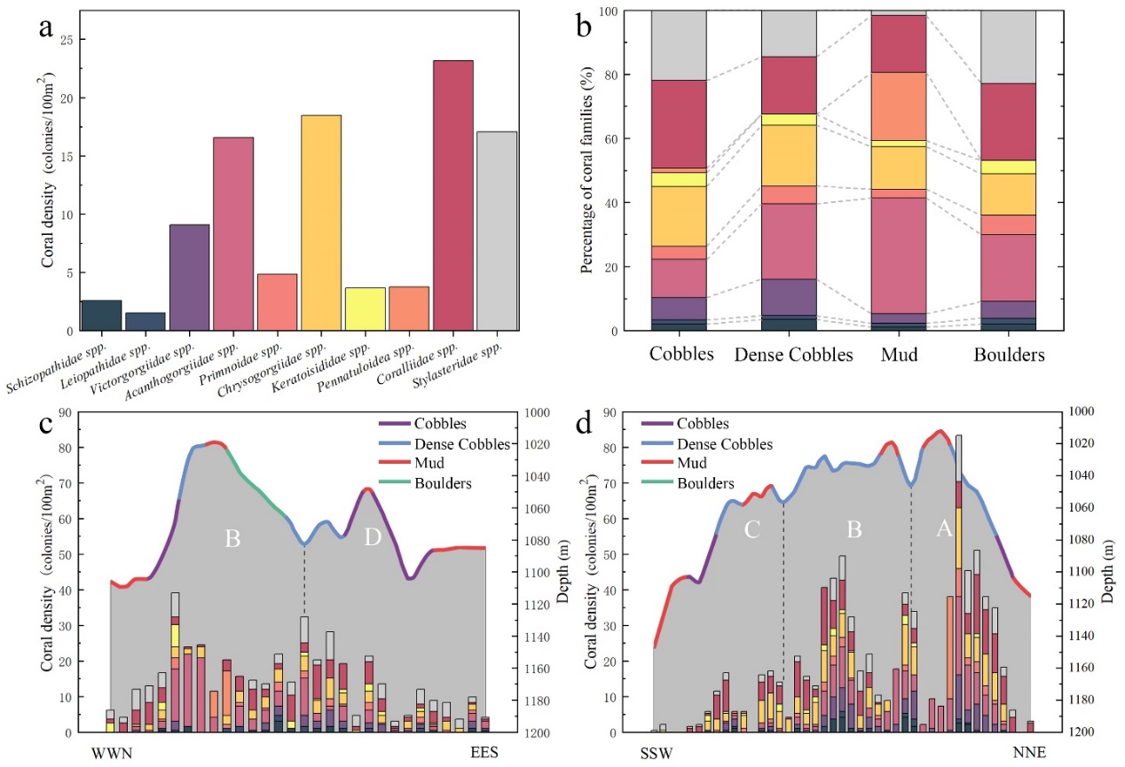图3该区域冷水珊瑚属种及其随地形和基底的分布特征